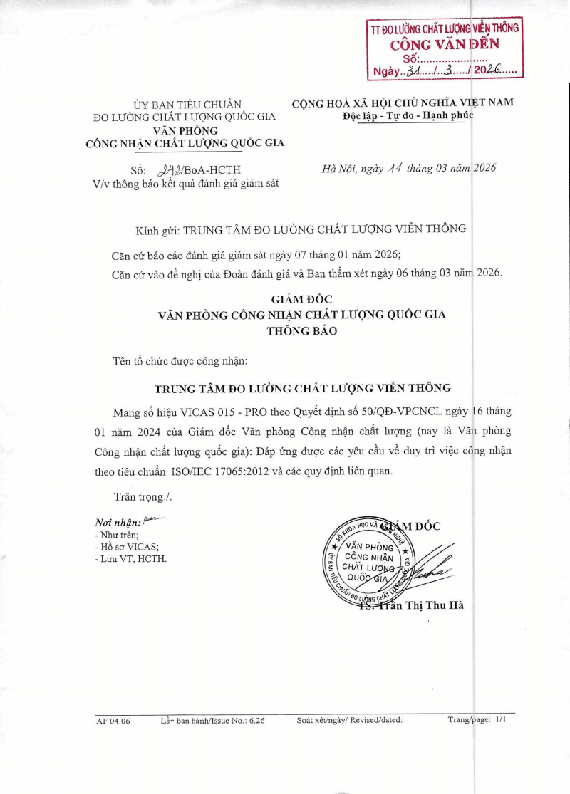 Thông báo kết quả đánh giá giám sát tiêu chuẩn ISO/IEC 17065:2012 của Văn phòng Công nhận Chất lượng Quốc gia