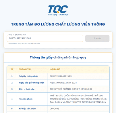 Nhằm nâng cao hiệu quả quản lý và tạo điều kiện thuận lợi cho các tổ chức, cá nhân trong việc tra cứu thông tin Giấy Chứng nhận hợp quy (CNHQ), Trung tâm Đo lường Chất lượng Viễn thông chính thức triển khai ứng dụng tra cứu thông tin Giấy CNHQ trên website của Trung tâm từ ngày 02/06/2025. Việc triển khai ứng dụng tra cứu thông tin Giấy CNHQ này nhằm mục đích: