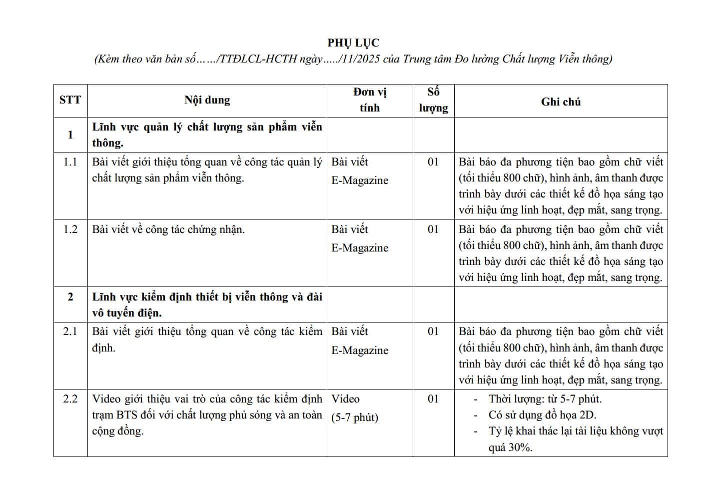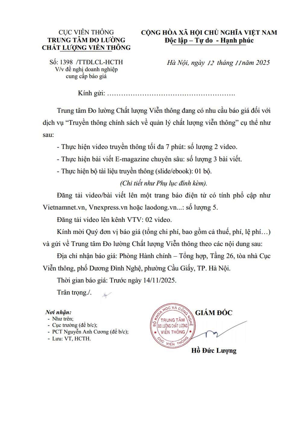 Thư mời báo giá cho dịch vụ “Truyền thông chính sách về quản lý chất lượng viễn thông”