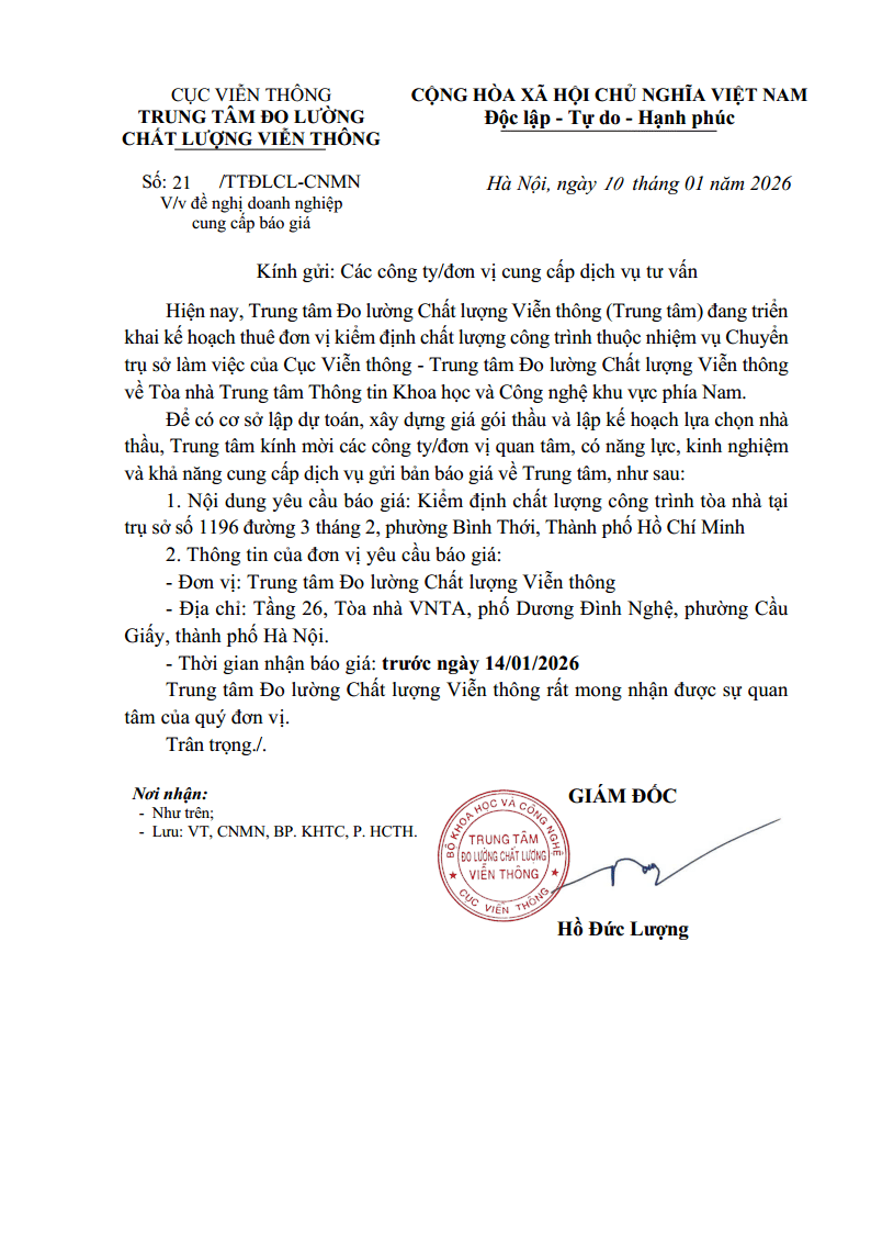 Thư mời báo giá thuê đơn vị tư vấn Lập và Thẩm tra báo cáo Kỹ thuật – Kinh tế gói thầu Xây dựng, hoàn thiện kiến trúc tòa nhà thuộc dự án Chuyển trụ sở Cục Viễn thông/Trung tâm Đo lường Chất lượng Viễn thông về Tòa nhà Trung tâm Thông tin Khoa học và Công nghệ phía Nam