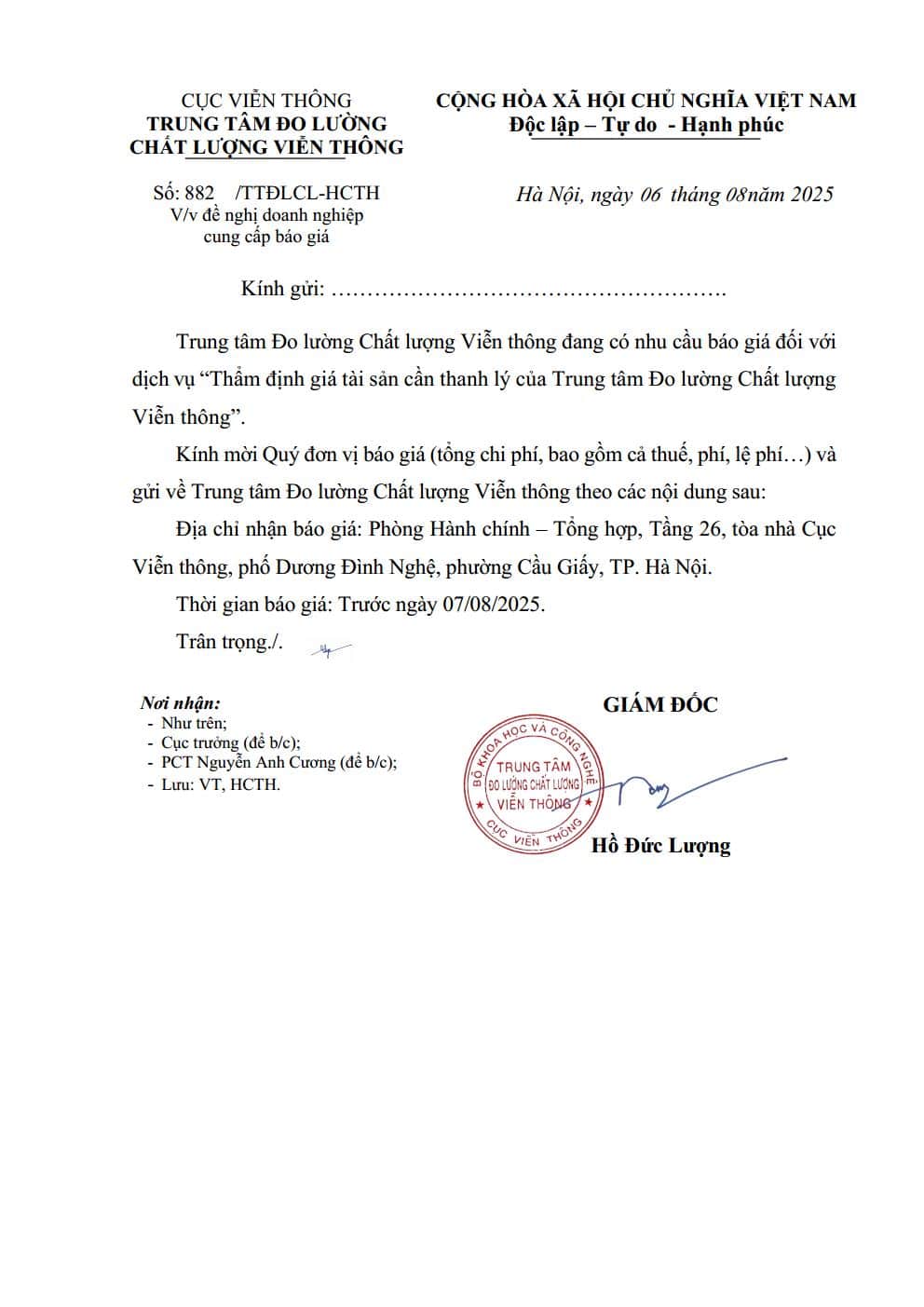 Thư mời báo giá đối với dịch vụ “Thẩm định giá tài sản cần thanh lý của Trung tâm Đo lường Chất lượng Viễn thông”