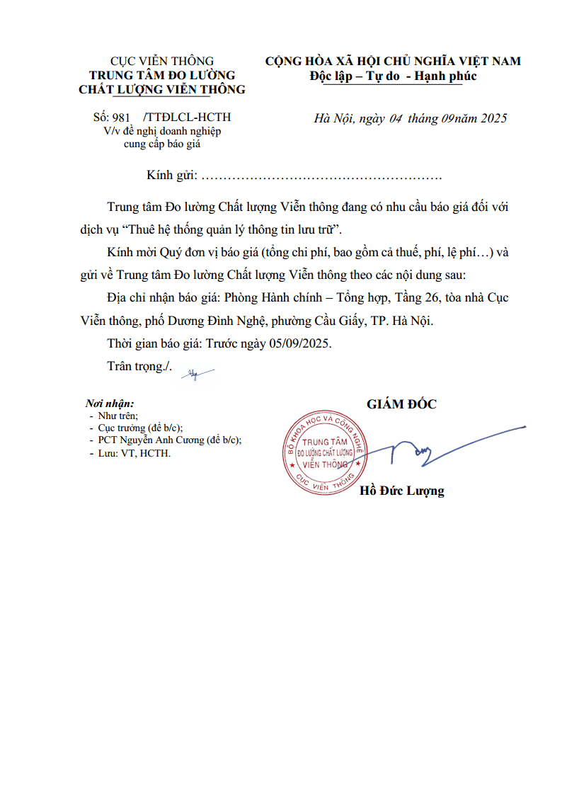 Thư mời báo giá đối với dịch vụ “Thuê hệ thống quản lý thông tin lưu trữ”