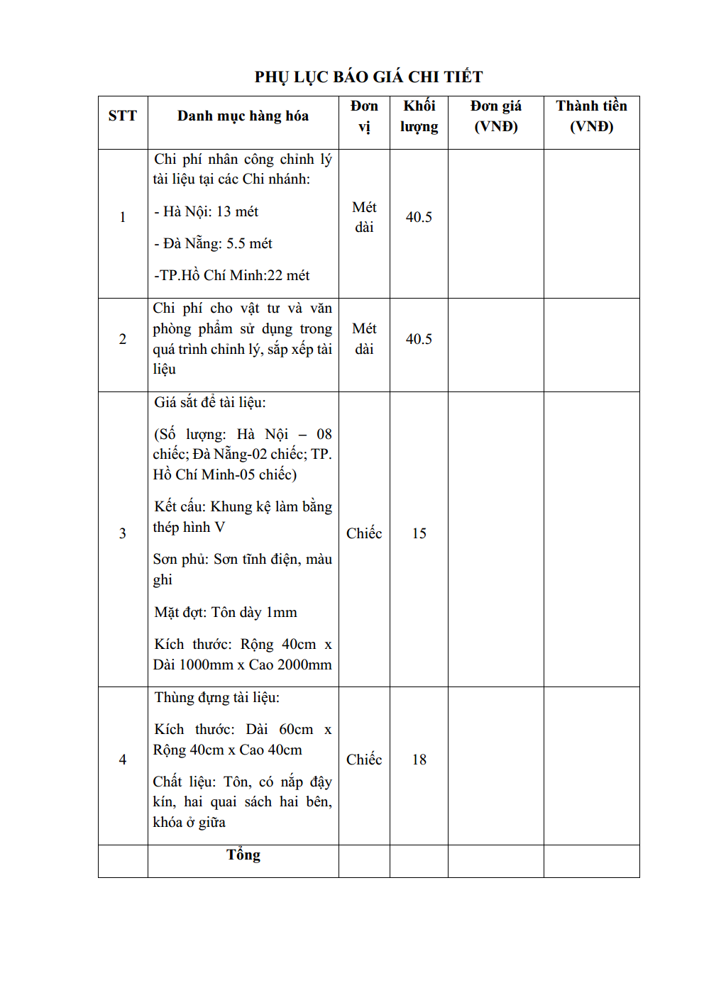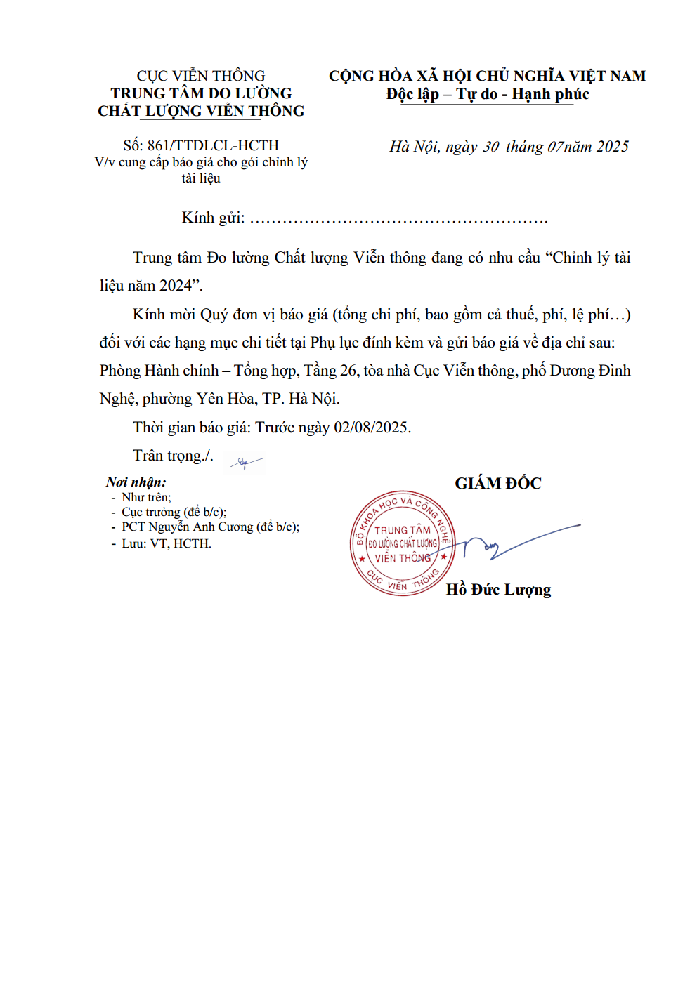 Thư mời cung cấp báo giá cho gói chỉnh lý tài liệu